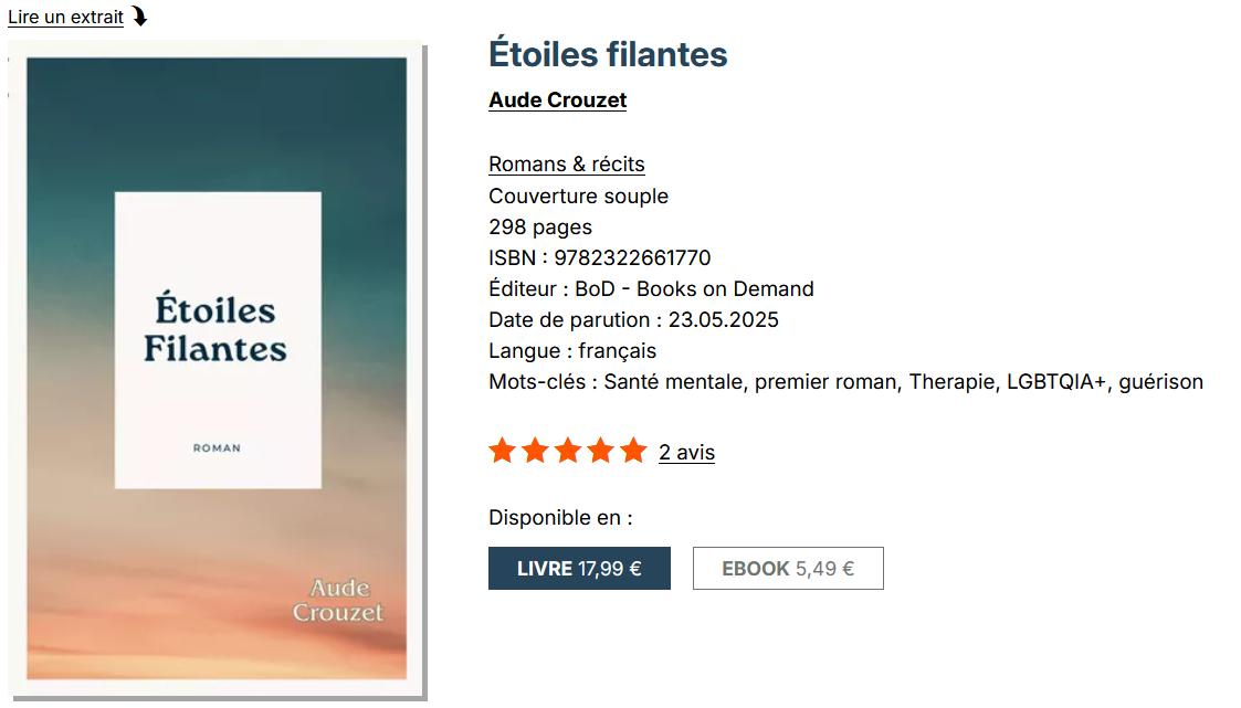 Dans les rayons de la boutique : Tous Aperçu Ebook Etoiles Filantes Prix promotionnel : 3,49 € Prix initial : 5,49 € Promotion Aperçu Roman dédicacé 19,99 € Aperçu Roman Etoiles Filantes 17,99 € Aperçu Marque-Pages "citation" 2,99 € Aperçu Marque-pages "étoiles" 2,99 € Aperçu Carnet A6 "mots doux" 5,99 € Aperçu Carnet A6 "nature" 5,99 € Pour les envois hors France métropolitaine, merci d’utiliser l’une des plateformes ci-contre : BoD : meilleure plateforme 〰️ BoD : meilleure plateforme 〰️ BoD : meilleure plateforme 〰️ Avis des lecteur.rice.s